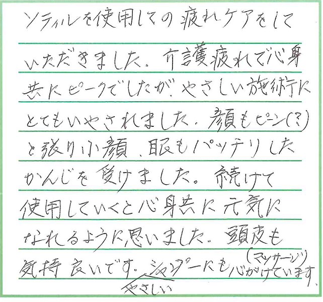 H.Fさま HOME>H.Fさま 岡山県 | 女性 | 70代 ソティルを使用しての疲れケアをしていただきました。介護疲れで心身共にピークでしたが、やさしい施術にとてもいやされました。顔もピーン(?)と張り小顔、眼もパッチリしたかんじを受けました。続けて使用していくと心身ともに元気になれるように思いました。頭皮も気持良いです。やさしいシャンプーにも(マッサージ)心がけています。