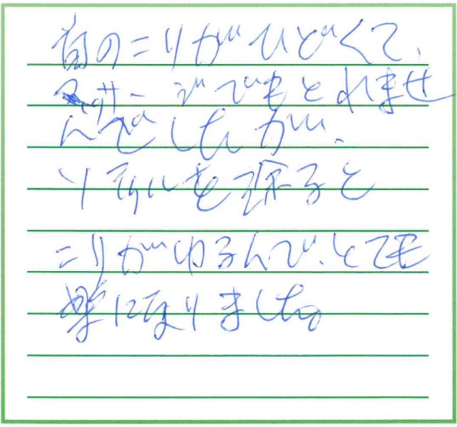 首のこりがひどくて、マッサージでもとれませんでしたが、ソティルを塗るとこりがゆるんでとても楽になりました。