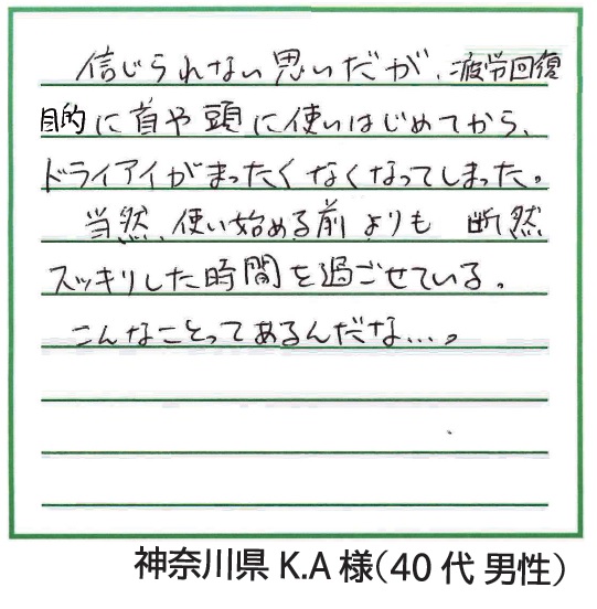 信じられない思いだが、疲労回復目的に首や頭に使いはじめてから、ドライアイがまったくなくなってしまった。当然、使い始める前よりも断然スッキリした時間を過ごせている。こんなことってあるんだな…。