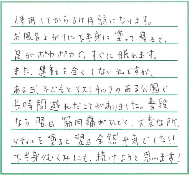 K.Mさま HOME>K.Mさま 岡山県 | 女性 | 30代 使用してから3ヶ月弱になります。お風呂上がりに下半身に塗って寝ると、足がポカポカで、すぐに眠れます。また、運動を全くしない私ですが、ある日、子どもとアスレチックのある公園で長時間遊んだことがありました。普段なら翌日筋肉痛がひどく、大変な所、ソティルを塗ると翌日全然平気でした!!下半身のむくみにも、続けようと思います!