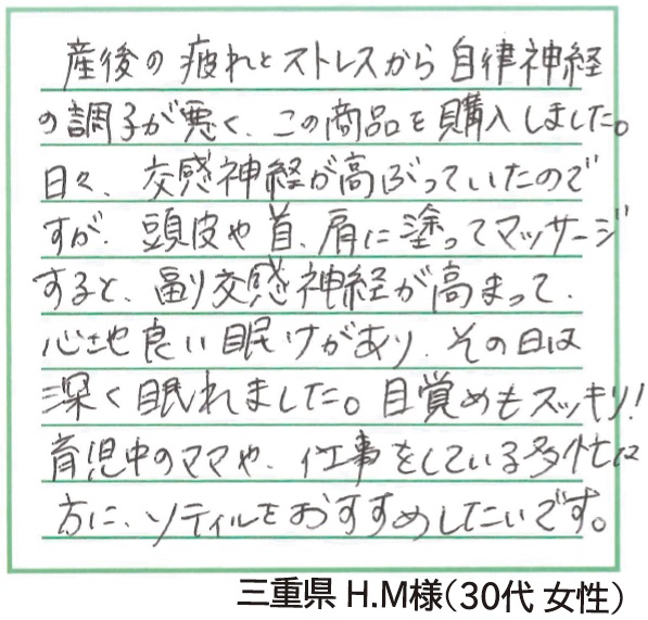 H.Mさま HOME>H.Mさま 三重県 | 女性 | 30代 産後の疲れとストレスから自律神経の調子が悪く、この商品を購入しました。日々、交感神経が高ぶっていたのですが、頭皮や首、肩に塗ってマッサージすると副交感神経が高まって、心地良い眠けがあり、その日は深く眠れました。目覚めもスッキリ!育児中のママや、仕事をしている多忙な方に、ソティルをおすすめしたいです。